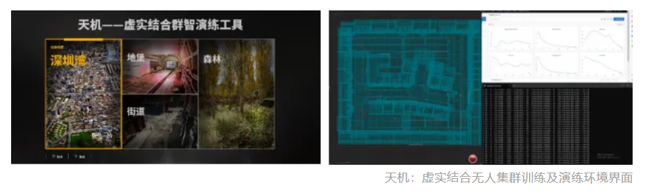 天机系统利用大语言模型赋能、多智能体协同,小规模训练、大规模应用,简化模型预训练、仿真环境调优等多种学习训练策略,支持了无人机和无人车组成的异构无人集群系统的强化学习训练,实现了200架无人机和50辆无人车组成的大规模异构无人集群自主协同完成对抗任务。